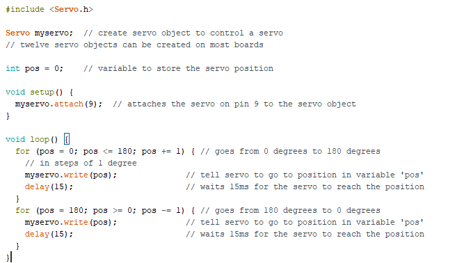 for문이 두 개가 있는데 위의 for 문은 pos를 0부터 180까지 넣고 모터에 전달하는 것을 볼 수 있습니다.