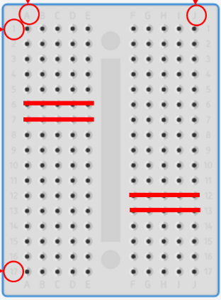 아래는 우리가 구입할 미니 브레드보드인데 빨간색 선과 같이 가로방향으로는 모두 연결되어 있습니다.