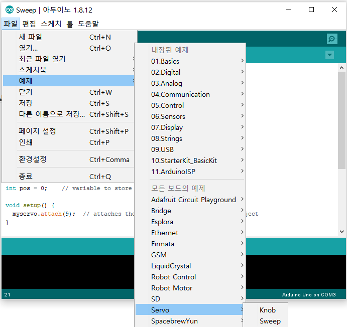 설치했던 IDE 프로그램을 실행시키면 서보 모터 구동 예제 소스코드가 있습니다.