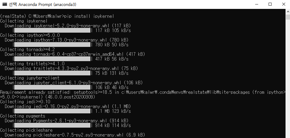 이제 realState 가상환경과 주피터를 연결하기 위해 ipykernel 패키지를 설치합니다.