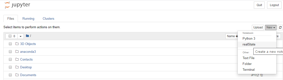 그리고 이제 주피터를 실행하면 오른쪽 메뉴에서 realState가 보이는 것을 확인할 수 있습니다.