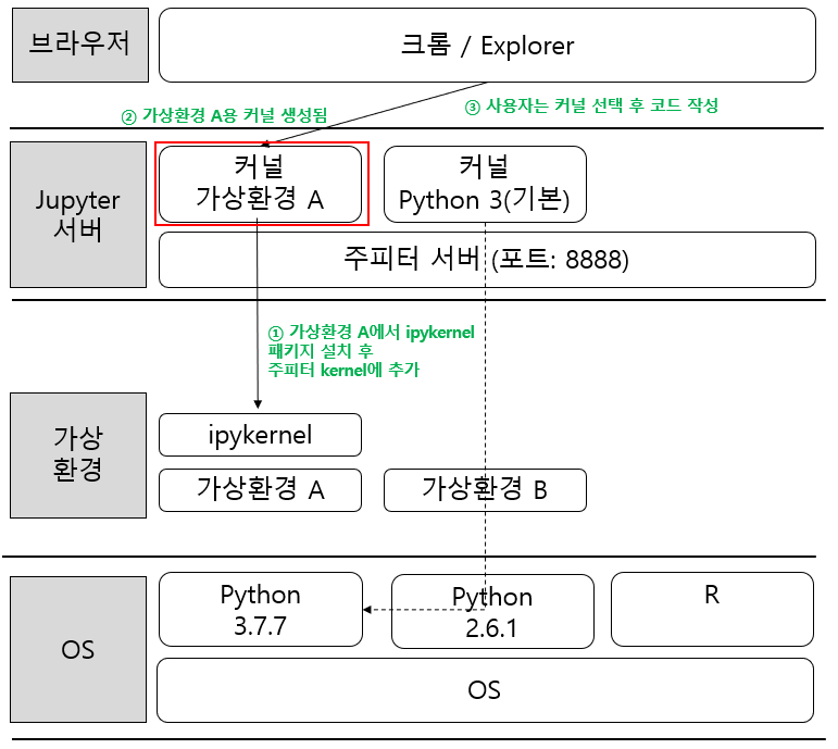 그래서 위 아키텍처 그림에서 가상환경 A와 주피터가 연결되어 있는 것이죠.