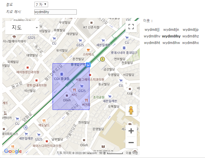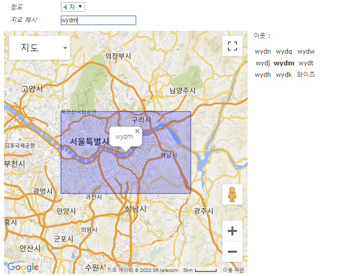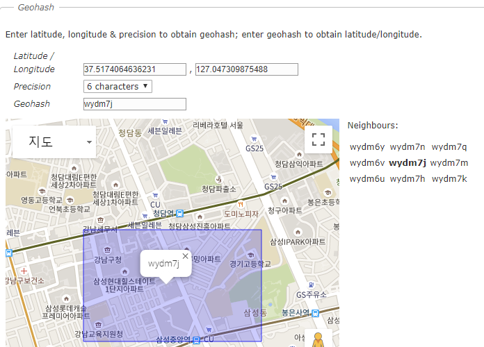 참고로 테스트해본 결과 인접한 구(가령 강남구 & 서초구)를 검색할 경우 같은 geohash를 리턴할 수 있습니다.