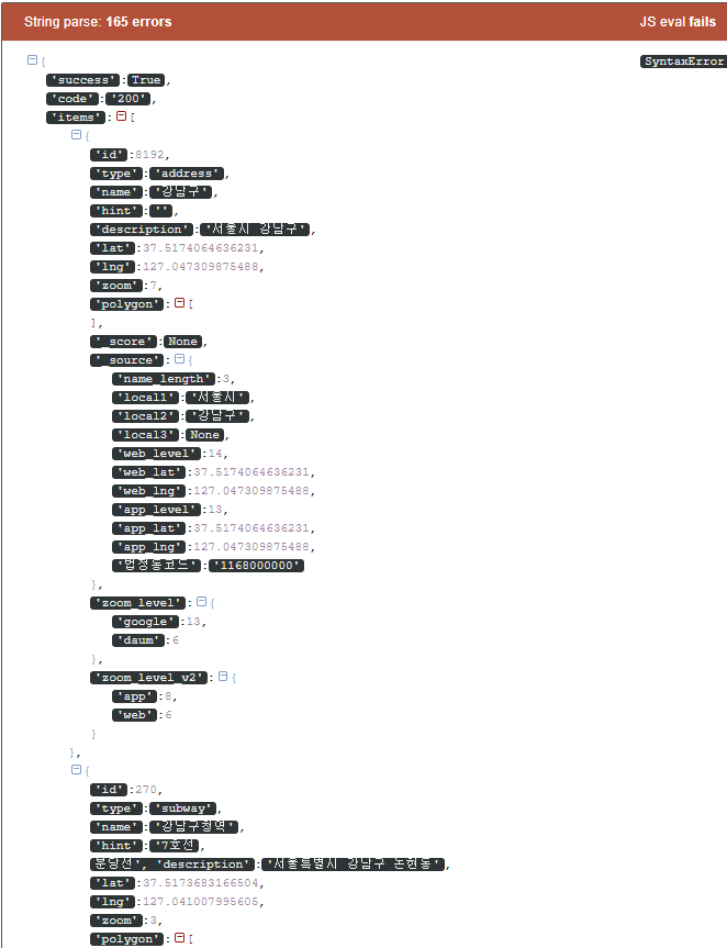 음... 결과가 보기 힘드므로 json 정리해주는 사이트에서 정리한 후 보겠습니다.