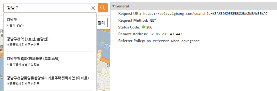 "강남구" 목록 중 "서울시 강남구"를 선택했을 때 item을 찾는 몇 가지 요청 중 하나에 wydm7이 있네요.