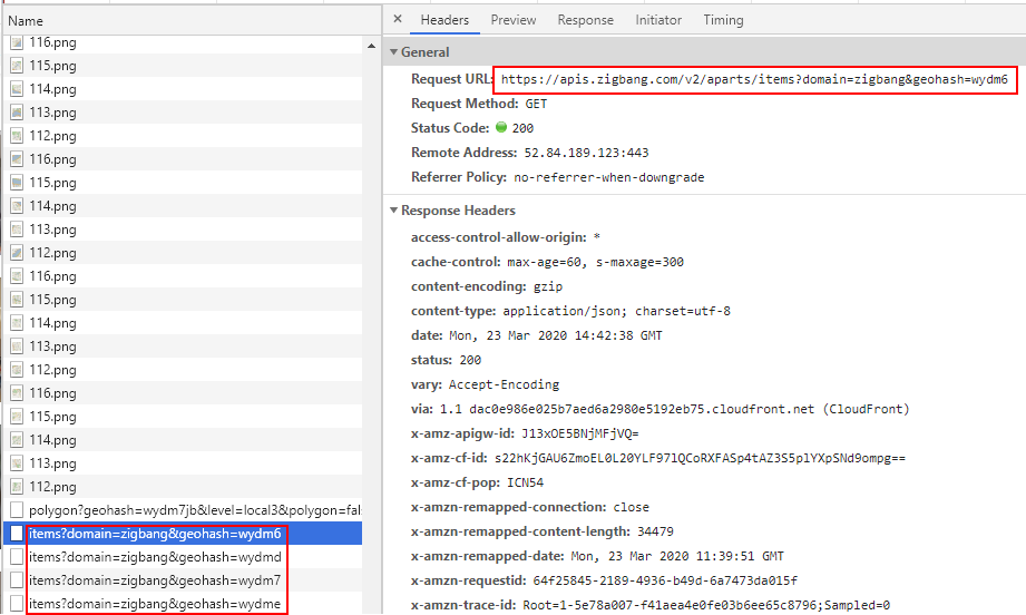 그렇습니다. geohash 값을 인수로 주고 있습니다. 이를 통해 아파트 item 값을 가져오는 겁니다.