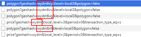 wydm6vy 와 같이 geohash 7레벨로 세분화해서 해당 지역의 아파트 목록을 건네주는 듯 합니다.