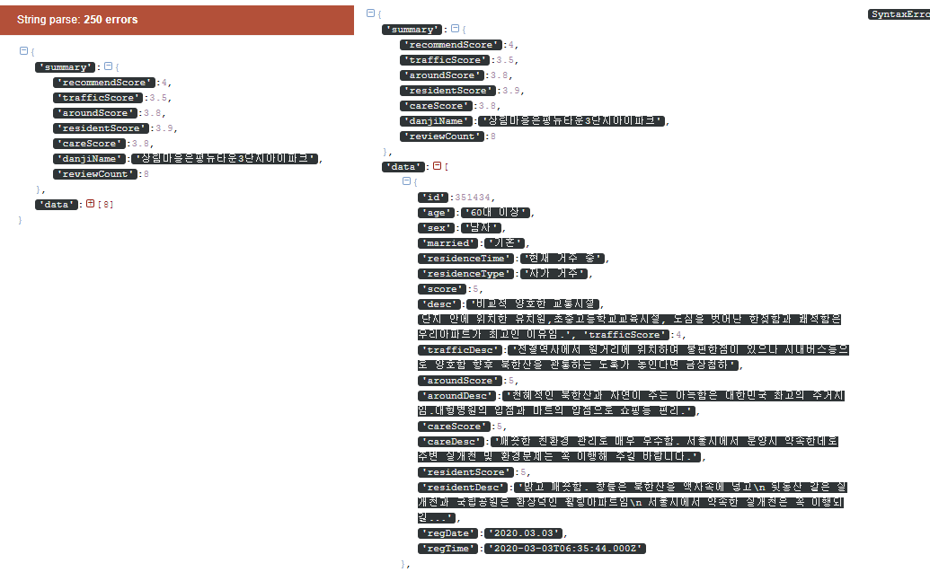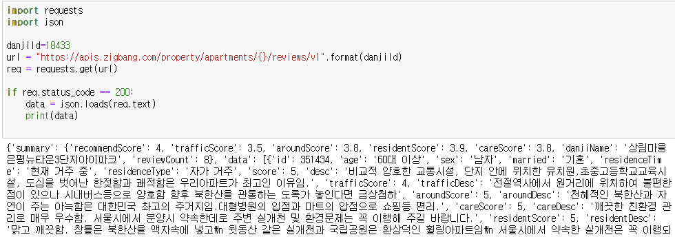 함수#1에서 아파트ID를 가져왔으면 해당 ID를 인수로 주어 리뷰 데이터를 가져오는 함수입니다.