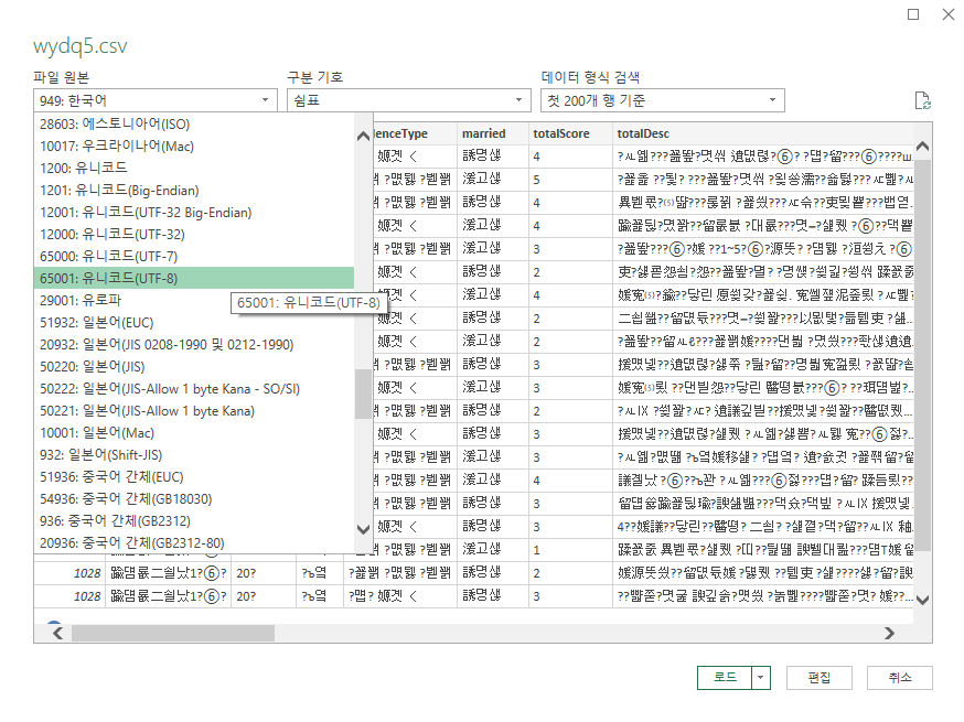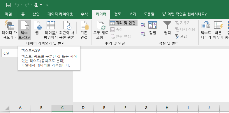 액셀로 열 때는 그냥 클릭해서 열지말고 아래와 같이 데이터 --> 텍스트/CSV에서 열도록 합니다.