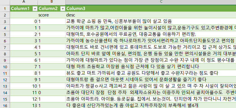 모델 훈련을 위해선 한글 데이터만 담긴 컬럼 1개와 점수 1컬럼만 있으면 됩니다.