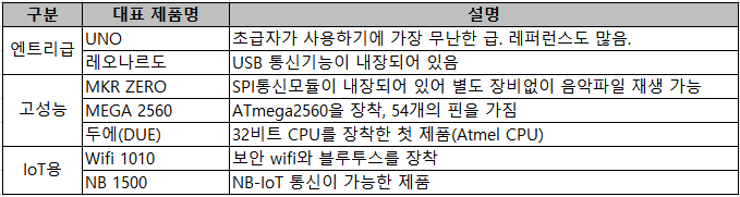 - 아두이노도 시간이 지남에 따라 새로운 모델이 계속 나오고 있고 용도에 따라서도 특징이 조금씩 다릅니다.