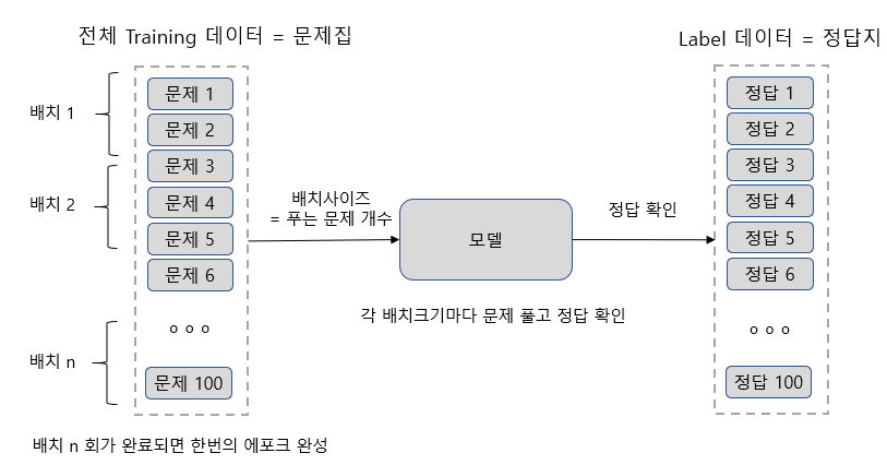 - training 데이터셋이 1000개이고 batch_size가 10이라면 100번의 지식 수정 작업이 일어나게 됩니다.