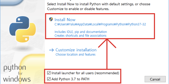설치할 때 아래와 같이 환경변수에 PATH를 추가해주도록 "Add Python 3.7 to Path" box를 체크합니다.