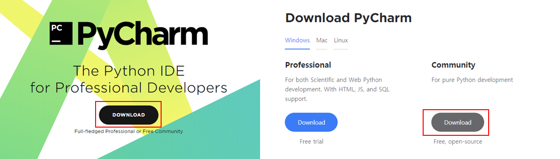 그럼 아래의 왼쪽의 Download 버튼이 있으며 클릭하면 오른쪽의 전문가용과 커뮤니티 버전으로 나뉩니다.
